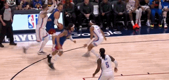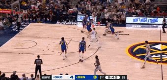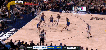 5月10日讯 NBA季后赛次轮G3,雷霆半场56-51领先掘金。